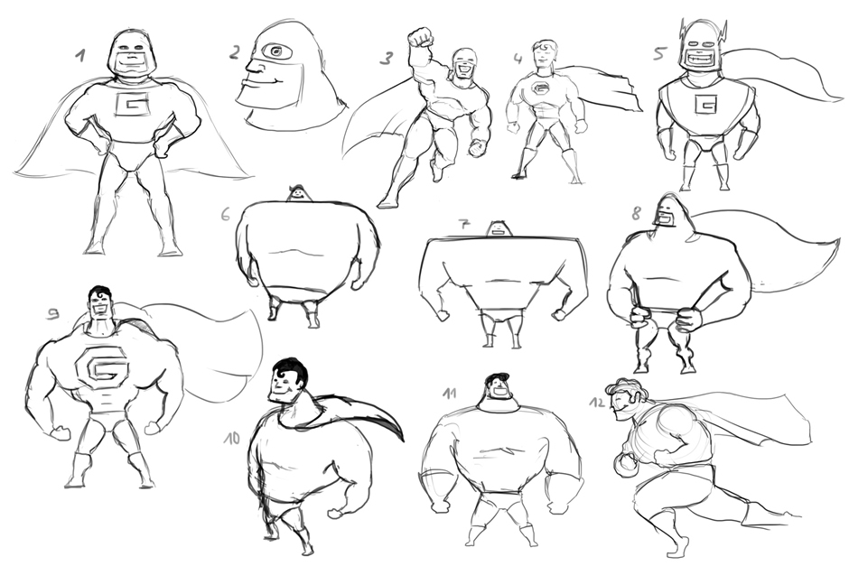 Die ersten Skizzen in verschiedenen Posen vom ausgewählten und optimierten Gutscheinhelden: