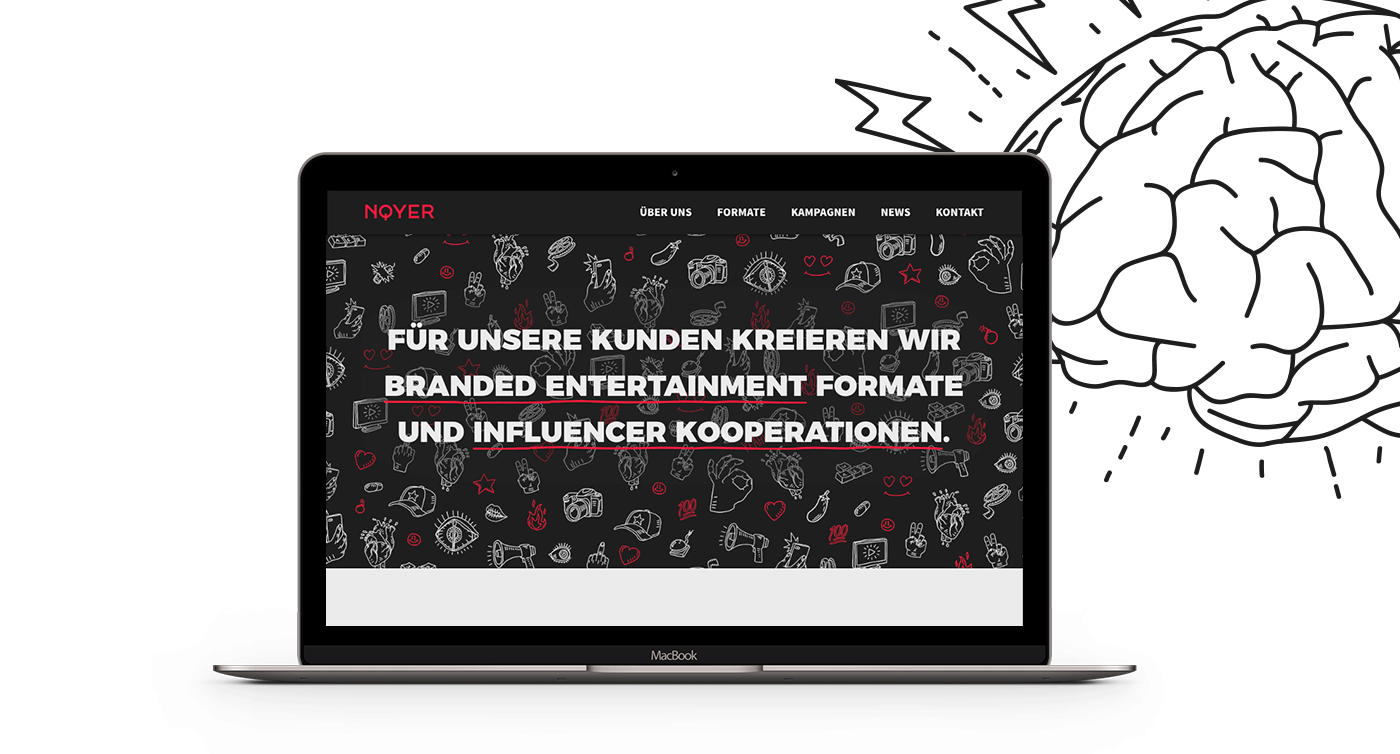 Our job was to freshen up the Nqyer brand – and make it look as cool as the Nqyer team itself. We created a new logo and bold design that focuses on a unique illustration style. The illustrations are inspired by Julian’s tattoos and the motifs revolve around Social Media and internet / pop culture. We then transferred the design to a new website and all kinds of business documents and materials.